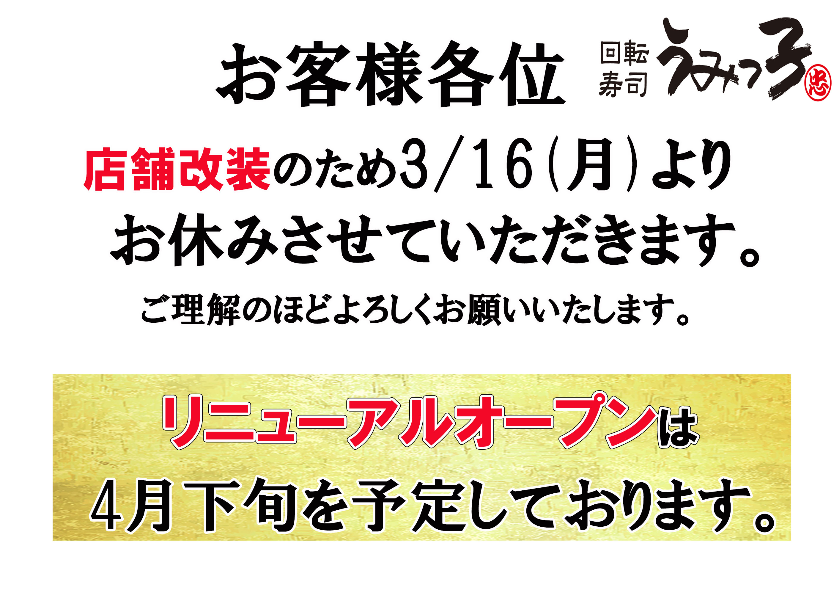 うみっ子朝倉店改装のお知らせ 2026年2月21日うみっ子, お知らせ, 愛知県知多市sushiplaza-maruchu Tweet うみっ子朝倉店をご利用いただきありがとうございます。 2026年3月16日(月)より店舗改装のためお休みさせていただき、リニューアルオープンは4月下旬ごろを予定しております。 3月15日(日)までの現店舗と4月下旬以降のリニューアルオープンした朝倉店を変わらずご愛顧いただきますようお願い申し上げます。